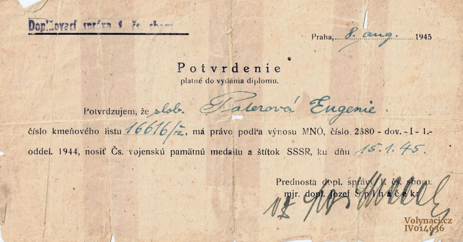 Potvrzení o právu nosit pamětní medaili, Rok: 1945, Zdroj: Archiv Daniela Šmatláka, Inventární číslo: IV014636